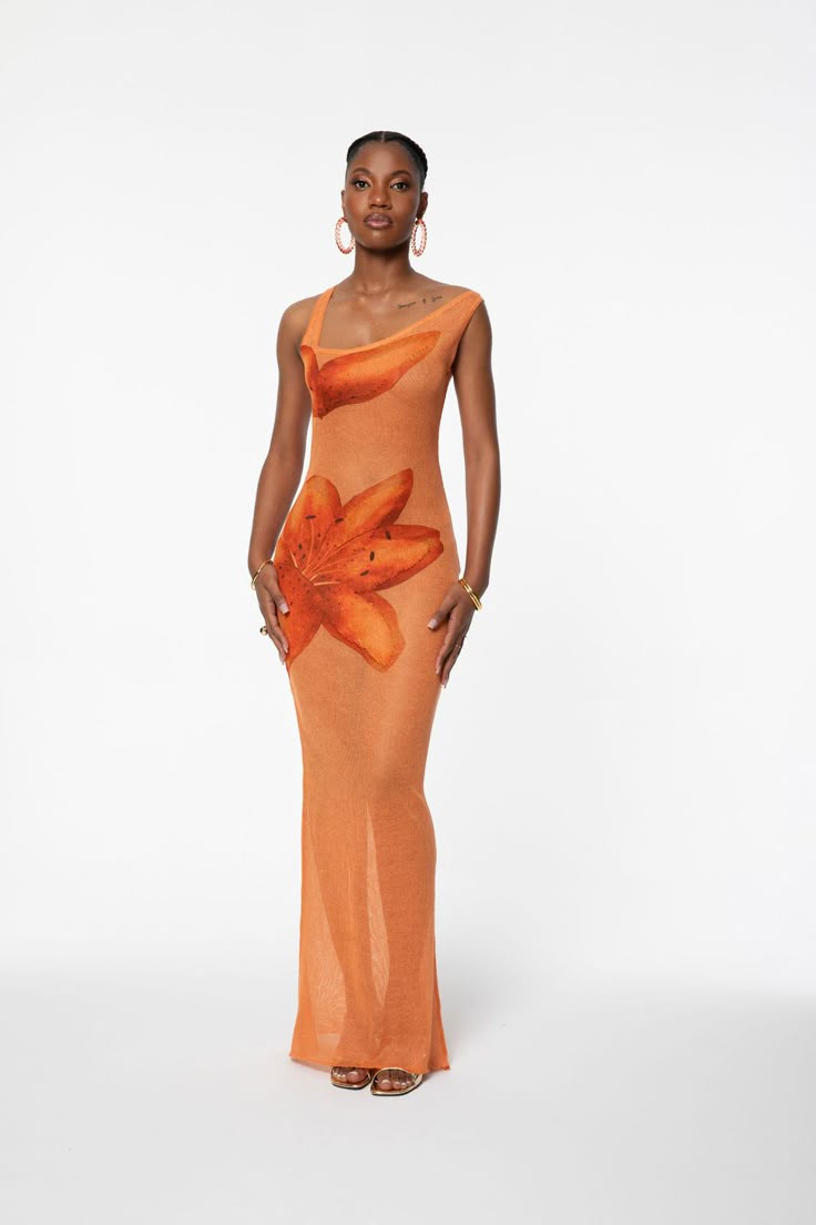 Hanifa Flora Sheer dress –Off shoulder neckline, sleeveless, flowy, modestly sheer, knit maxi dress. Ankle length.Fabric composition:100% Viscose blend