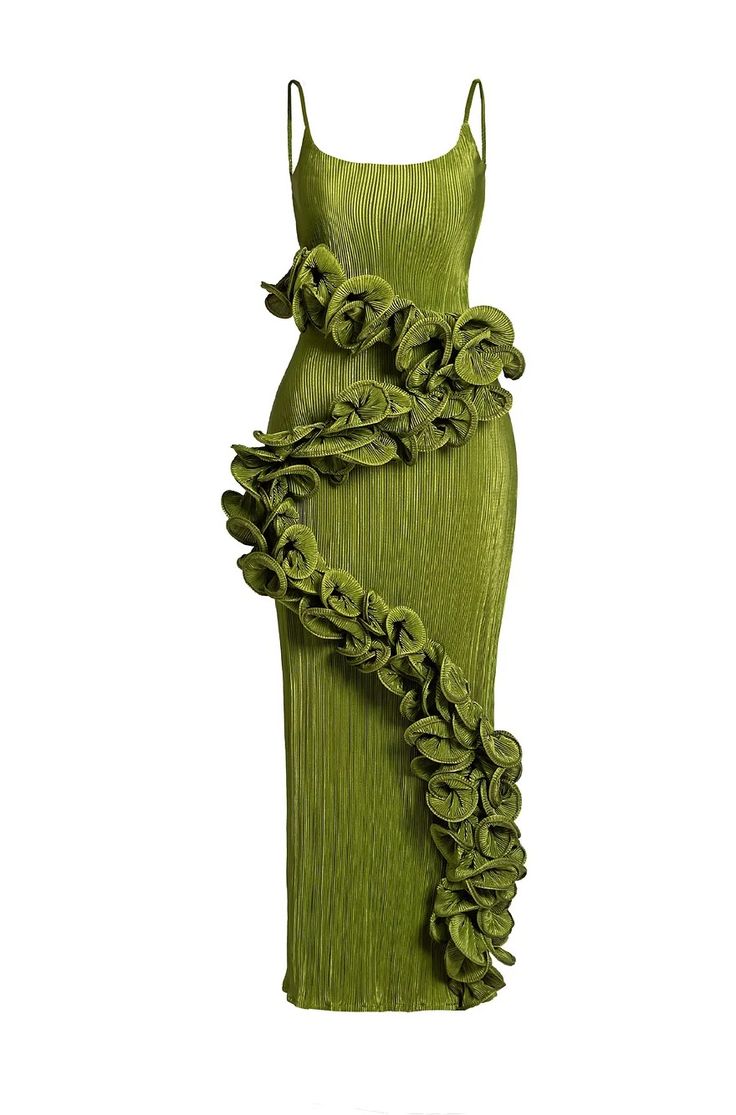 Rendoll - Abba Backless dress features a plisse fabric, ruffle detailing at the front, and a cowl back with back tie.