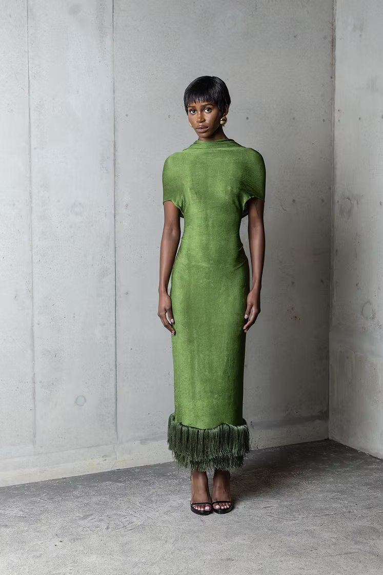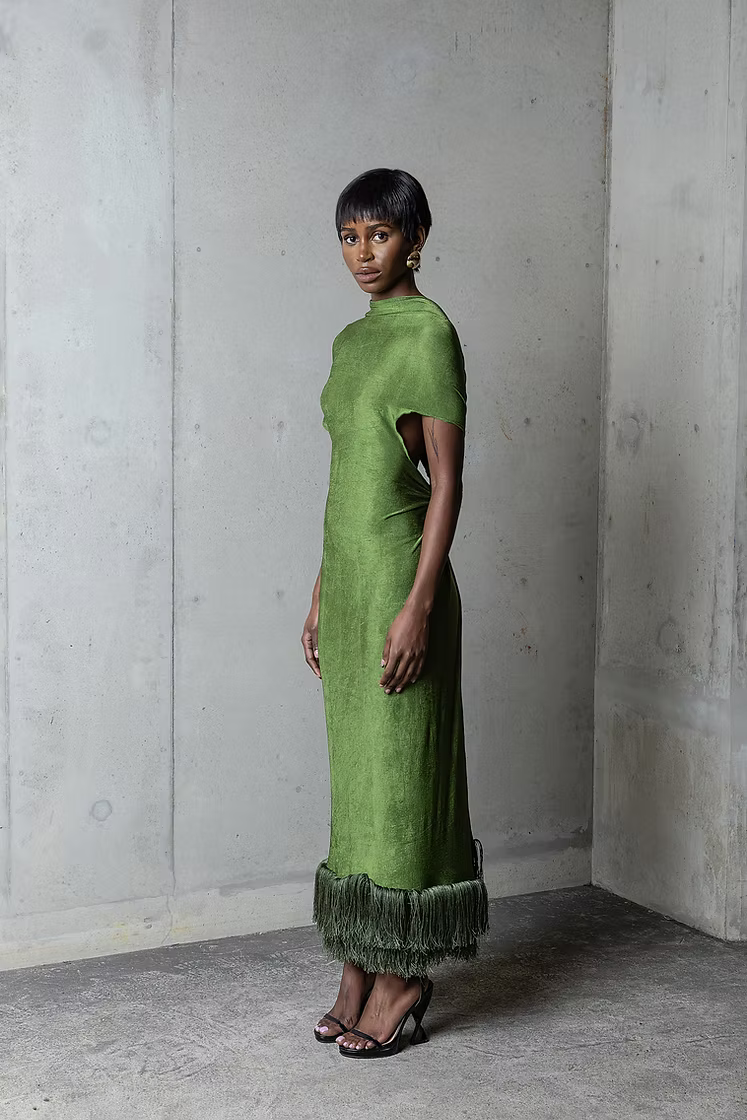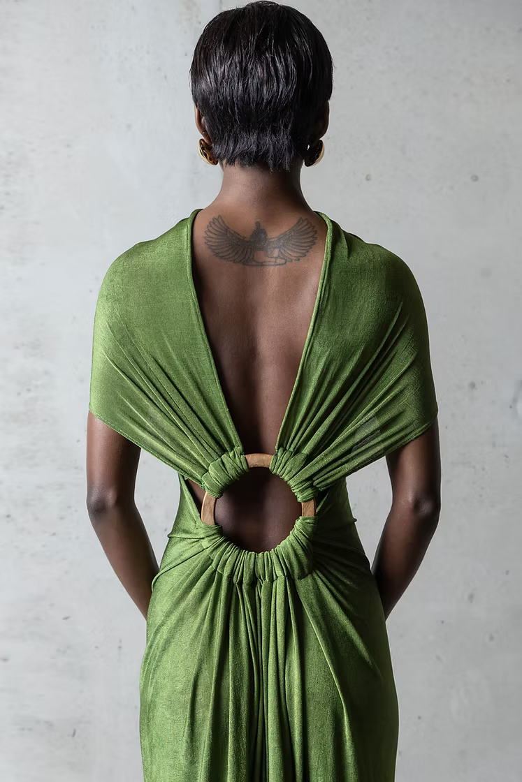 Anko – green, cocktail dress features a high neckline and a dramatic open back with a striking circular wooden detail that adds a unique touch. Figure hugging silhouette with delicate fringe at hem.