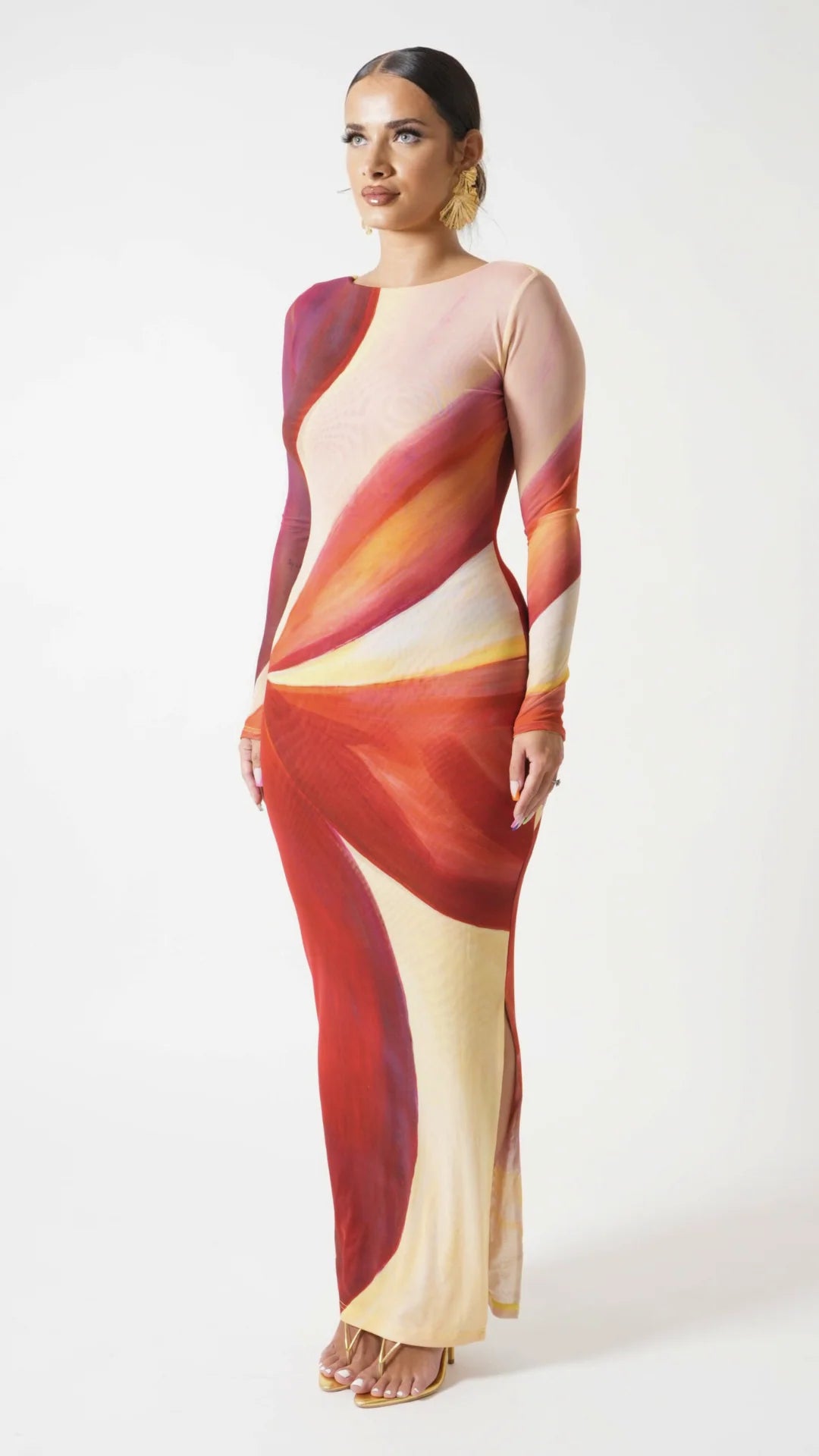 Farai London – Aphrodite Long Sleeve Maxi Dress. Body-contouring mesh maxi dress featuring a high neckline, long sleeves and a dramatic thigh-high slit.